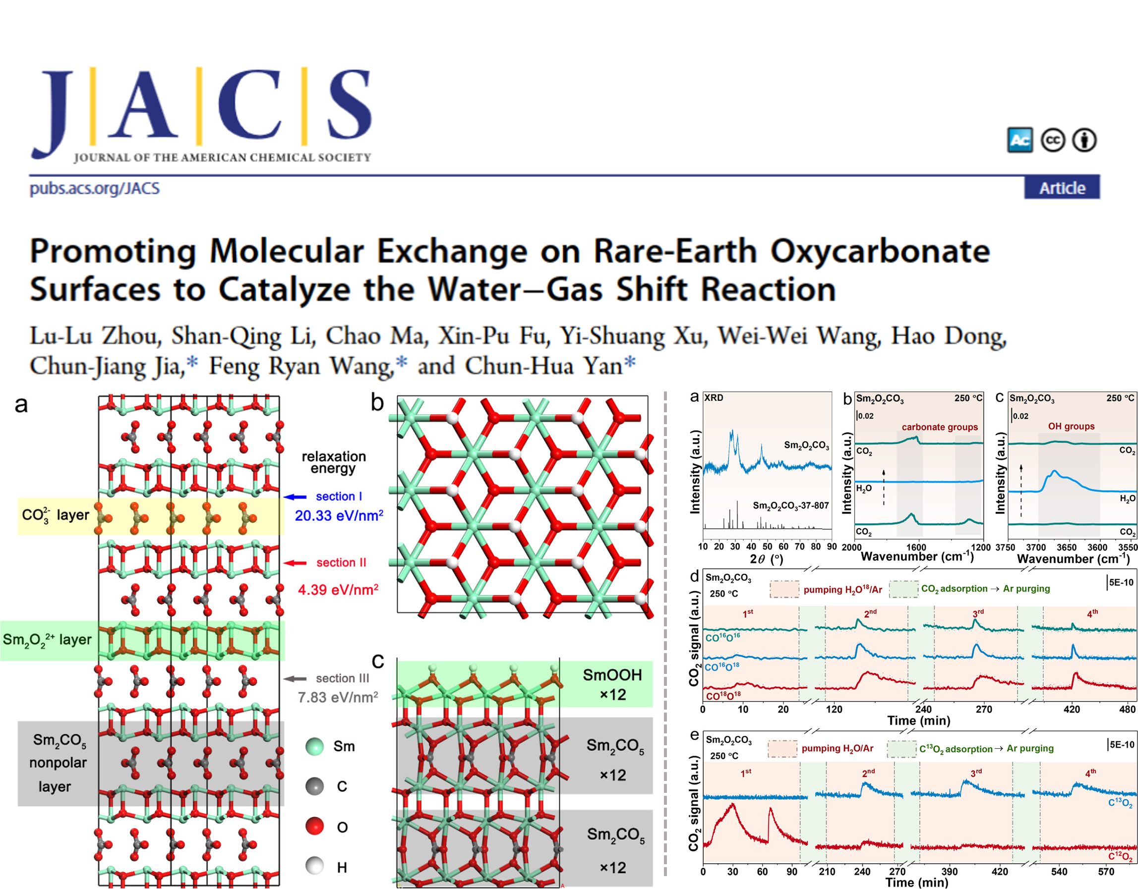 通过沉积沉淀法制备了一系列 Ln2O2CO3 支持的铜催化剂,为水气变换(WGS)反应提供了优异的催化活性和稳定性。密度泛函理论计算结合系统实验表征验证了 H2O 在 Ln2O2CO3 表面自发解离,通过释放 CO2 消除碳酸盐形成羟基。这种交换有效地促进了局部表面的 WGS 反应平衡移动,并防止了碳酸盐积累对活性位点的毒化。这种独特的层状结构为 WGS 反应提供了所谓的 "自清洁 "活性表面,为稀土氧碳酸盐纳米材料在 C1 化学中的应用开辟了新的前景。