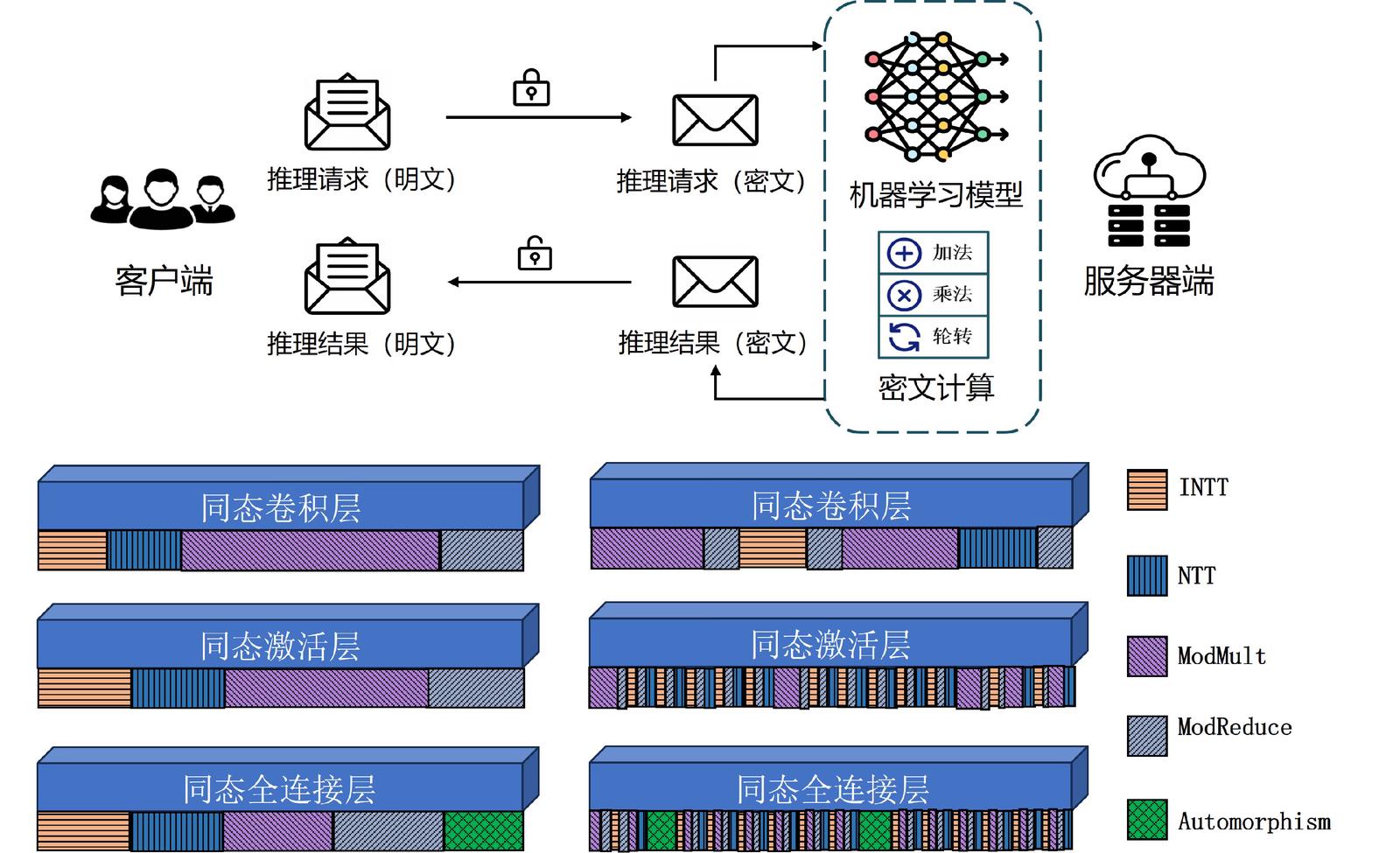 全同态加密(FHE)允许直接对密文进行通用计算得到密态计算结果,其安全性基于数学困难问题,不需要额外的信任假设即可实现数据的“可用、可控、不可见”,被国内外多位著名密码学家称作密码学中的圣杯。尽管全同态加密技术的广阔发展前景得到学术界和工业界的一致认可,但极低的计算性能是其在实际应用场景中落地面临的关键挑战。研究表明,全同态加密相比对应的明文计算通常引入4至6个数量级的额外计算和存储开销。同态加密性能瓶颈的突破取决于算法优化与硬件加速技术的共同进步。