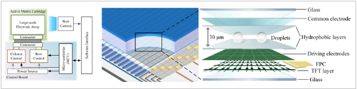 基于介电润湿(EWOD)效应的有源矩阵数字微流控(AM-DMF)技术,为液体生物样本的高通量操控提供了自动化水平更高、集成性更强的解决方案。AM-DMF通过采用薄膜晶体管(TFT)有源矩阵背板,克服了传统无源矩阵架构的可扩展性限制,能够同时并行操控数万个微液滴。然而,随着生物医学实验对通量和集成度要求的不断提高,AM-DMF系统也面临新的挑战:阵列规模扩大带来的薄膜晶体管泄漏电流问题,可能影响液滴操控的稳定性;系统需集成实时液滴位置传感功能,以实现闭环控制;此外,在万级液滴并行操控的场景下,人工路径规划已无法满足需求,必须借助高效算法实现自动路由。
