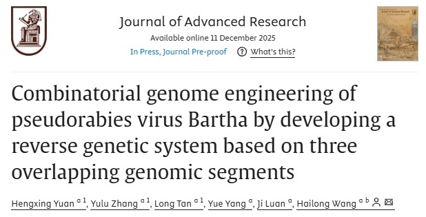 2025年12月11日,Journal of Advanced Research期刊(5年IF=11.6,综合性1区Top期刊)在线发表了山东大学微生物改造技术全国重点实验室王海龙教授课题组的研究论文“Combinatorial genome engineering of pseudorabies virus Bartha by developing a reverse genetic system based on three overlapping genomic segments”。 王海龙教授为论文通讯作者,博士后袁恒星、博士生张雨璐和已毕业硕士生谭龙为共同第一作者。山东大学微生物改造技术全国重点实验室为第一完成单位和通讯作者单位。