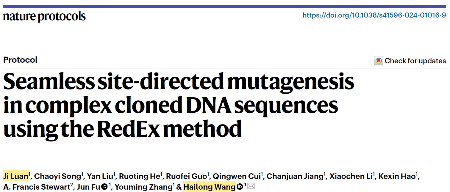 2024年7月15日,Nature Protocols(5年影响因子17.4,生化研究方法1区Top期刊)在线发表了山东大学微生物技术国家重点实验室王海龙教授课题组的研究论文“Seamless site-directed mutagenesis in complex cloned DNA sequences using the RedEx method”。王海龙教授为论文通讯作者,栾霁副研究员为论文第一作者。