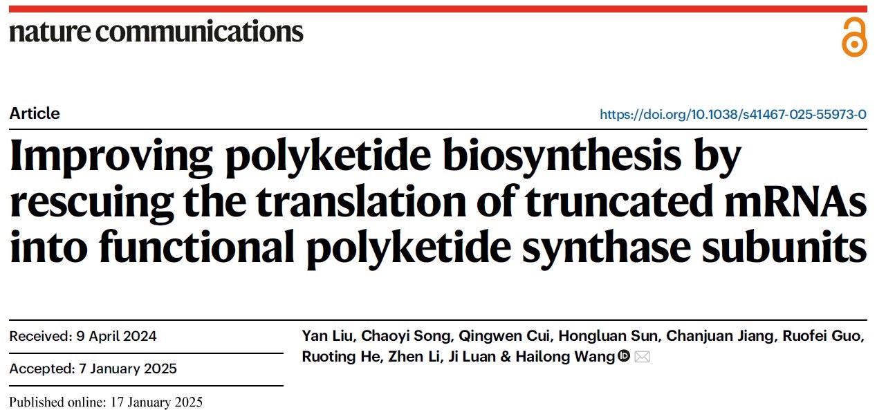 2025年1月17日,Nature Communications(5年影响因子16.1,综合性一区TOP期刊)在线发表了山东大学微生物技术国家重点实验室王海龙教授课题组的研究论文“Improving polyketide biosynthesis by rescuing the translation of truncated mRNAs into functional polyketide synthase subunits”。王海龙教授为论文通讯作者,博士生刘焱为论文第一作者。
