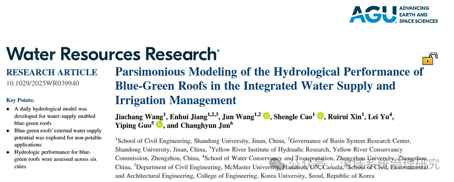 近日,山东大学流域中心王俊团队在水文水资源领域国际顶尖学术期刊《Water Resources Research》发表了题为“Parsimonious Modeling of the Hydrological Performance of Blue-Green Roofs in the Integrated Water Supply and Irrigation Management”的最新论文成果。山东大学为第一单位,论文第一作者为硕士研究生王家昌,通讯作者为王俊副教授,校内合作作者包括江恩慧教授、曹升乐教授和硕士研究生辛瑞瑞,校外合作作者包括郑州大学副教授于磊、加拿大麦克马斯特大学教授Yiping Guo和韩国高丽大学副教授Changhyun Jun。据悉,该论文是山东大学作为第一单位首次在《Water Resources Research》发表论文。