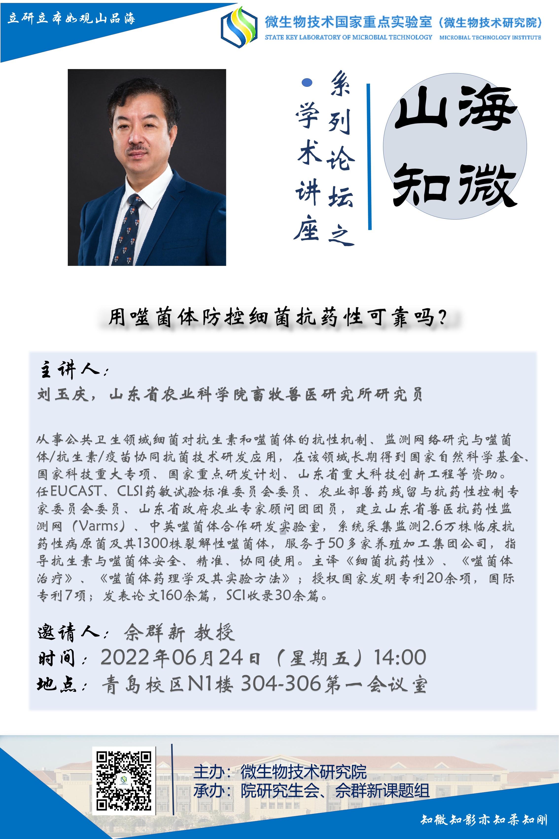 2022年6月24日,山东省农业科学院畜牧兽医研究所刘玉庆研究员应微生物技术国家重点实验室佘群新教授的邀请,做客“山海知微”系列论坛,作了以“用噬菌体防控细菌抗药性可靠吗?”为题的学术报告。本次讲座由佘群新教授主持。微生物技术研究院王海龙副院长,以及谷立川教授、申玉龙教授、倪金凤教授、石梅教授等约40位师生参加了此次学术报告会并相关科研进行了深入讨论。
