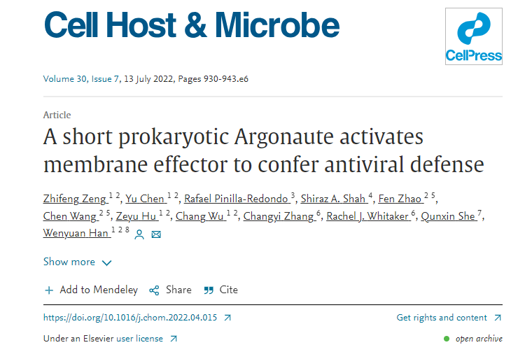 A short prokaryotic Argonaute activates membrane effector to confer antiviral defense.