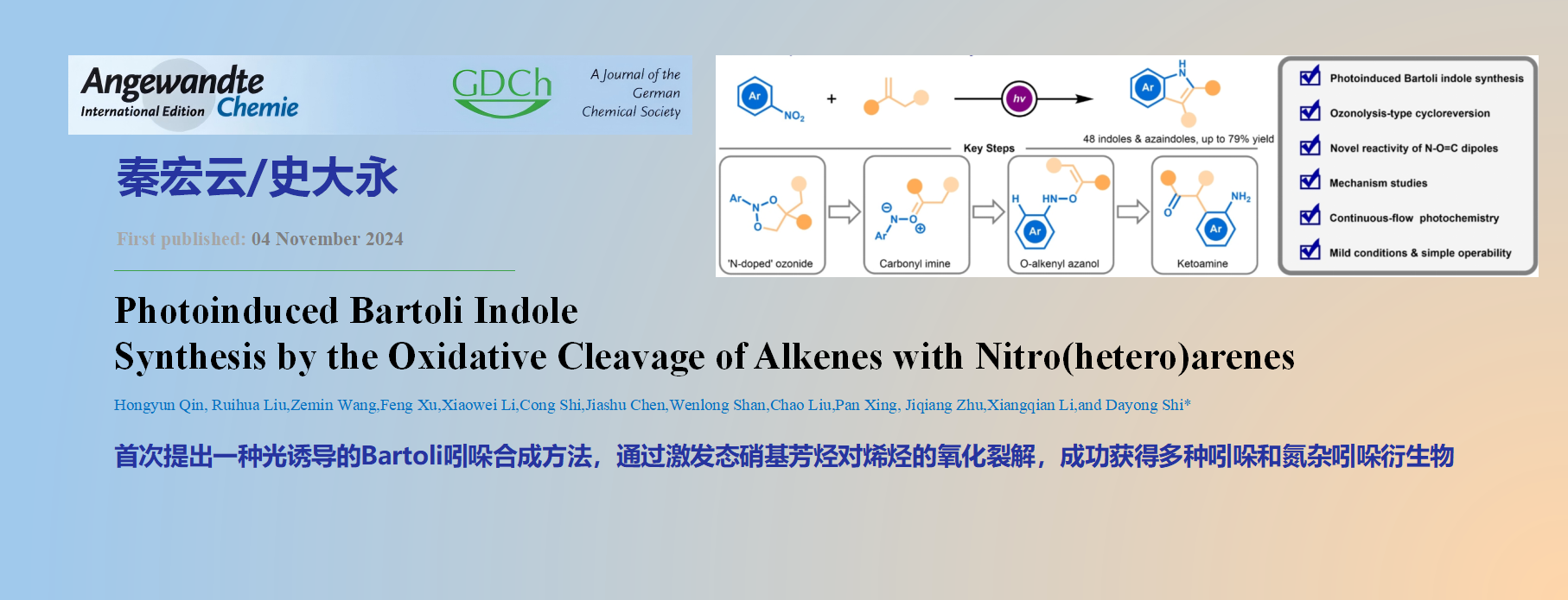 本文首次报道了一种光诱导Bartoli吲哚合成方法,通过激发态硝基芳烃对烯烃的氧化裂解,成功获得多种吲哚和氮杂吲哚衍生物。N-O=C偶极子新的产生方式和反应性增强了对偶极化学的理解。机理研究和DFT计算支持该反应涉及自由基环加成、臭氧解型环裂解、羰基亚胺中间体分子内氢迁移以及O-烯基羟胺的3,3-σ重排等过程。特别地,采用连续流动光化学技术显著提高了反应效率,克服了商业化过程中存在的障碍。