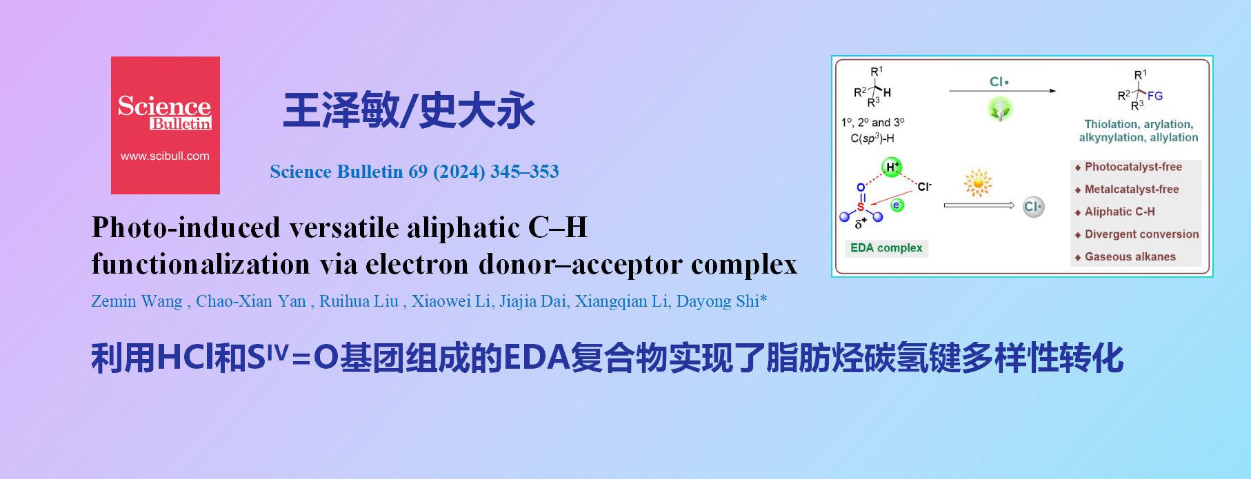 为了填补该不足,我们利用HCl和SIV=O基团组成的EDA复合物实现了脂肪烃碳氢键多样性转化。其中作为有效氢原子转移试剂的氯自由基可经由质子耦合电子转移途径生成,并以此发展了C(sp3)-H硫代、芳基化、烯丙基化、炔基化等多种反应,且无需光催化剂和金属催化剂的参与。同时,对该新颖转化机制进行了深入探索,包括各种对照试验、中间体捕获、光谱检测、DFT计算等。该转化具备多种优良特性,包括简单温和的反应条件、较好的官能团兼容性与底物普适性,特别是为大宗气态烷烃的高附加值绿色转化提供了一种可选择的解决方案。