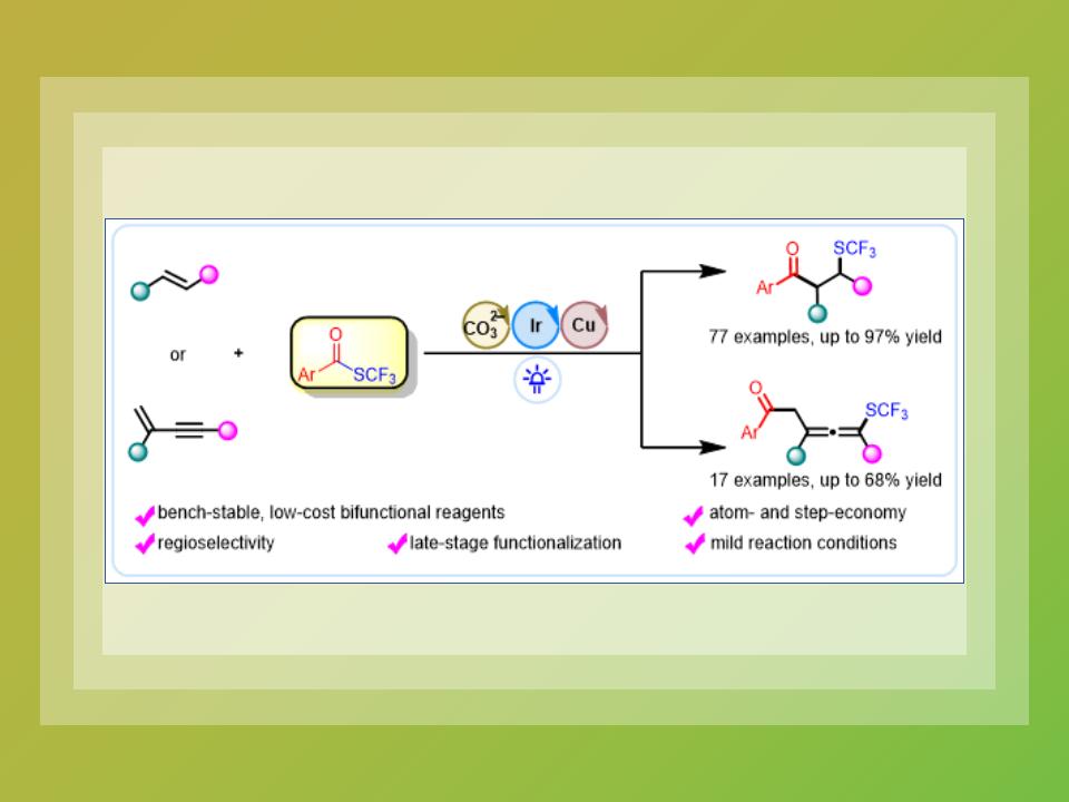 作者在可见光催化领域取得重要突破,开发了一种新型的三氟甲硫基试剂。以S-三氟甲基硫酯作为三氟甲硫基负离子源和酰基自由基前体,在可见光和过渡金属铜的共催化下,首次实现了烯烃的1,2-酰基-三氟甲硫化反应和1,3-烯炔的1,4-酰基-三氟甲硫基化反应,合成了一系列三氟甲硫基化合物的新方法。