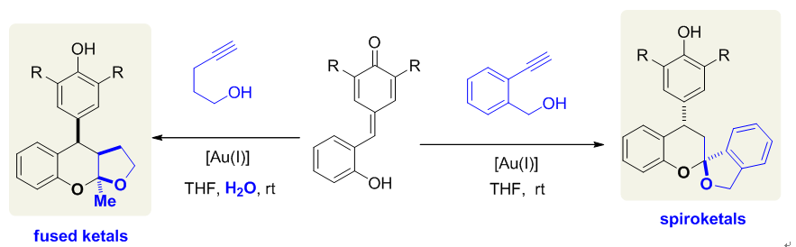 Mao, W.; Lin, S.; Zhang, L.; Lu, H.; Jia, J.*; Xu, Z.*, Gold-catalyzed domino reactions of alkynol and p-quinone methides: divergent synthesis of fusedand spiro-ketals