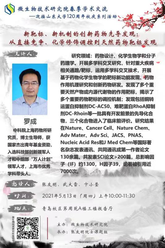 上海药物所罗成研究员应微生物技术国家重点实验室主任张友明教授和本课题组武大雷教授的邀请,于21年5月13日做客“山海知微”系列论坛学术讲座,并作了题为新靶标、新机制的创新药物先导发现与作用机制研究:从化学仿生调控到天然药物靶标发现”的学术报告。讲座由武大雷教授主持。