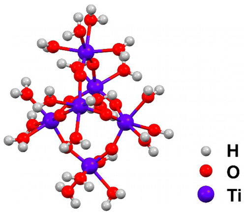 - A new titanium(IV) oxo cluster comprised of only Ti, O, and H atoms, [Ti6(Oμ)8(OtH2)20]8+, was isolated from water and thoroughly characterized. This type of a relatively rare isopolyoxocationic cluster with no organic ligands is stabilized by hydrogen-bonded counteranions.