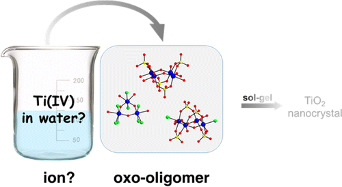 - For sol–gel synthesis of titanium oxide, the titanium(IV) precursors are dissolved in water to form clear solutions. However, the solution status of titanium(IV) remains unclear. Herein three new and rare types of titanium oxo clusters are isolated from aqueous solutions of TiOSO4 and TiCl4 without using organic ligands. Our results indicate that titanium(IV) is readily hydrolyzed into oxo oligomers even in highly acidic solutions. The present clusters provide precise structural information for future characterization of the solution species and structural evolution of titanium(IV) in water an