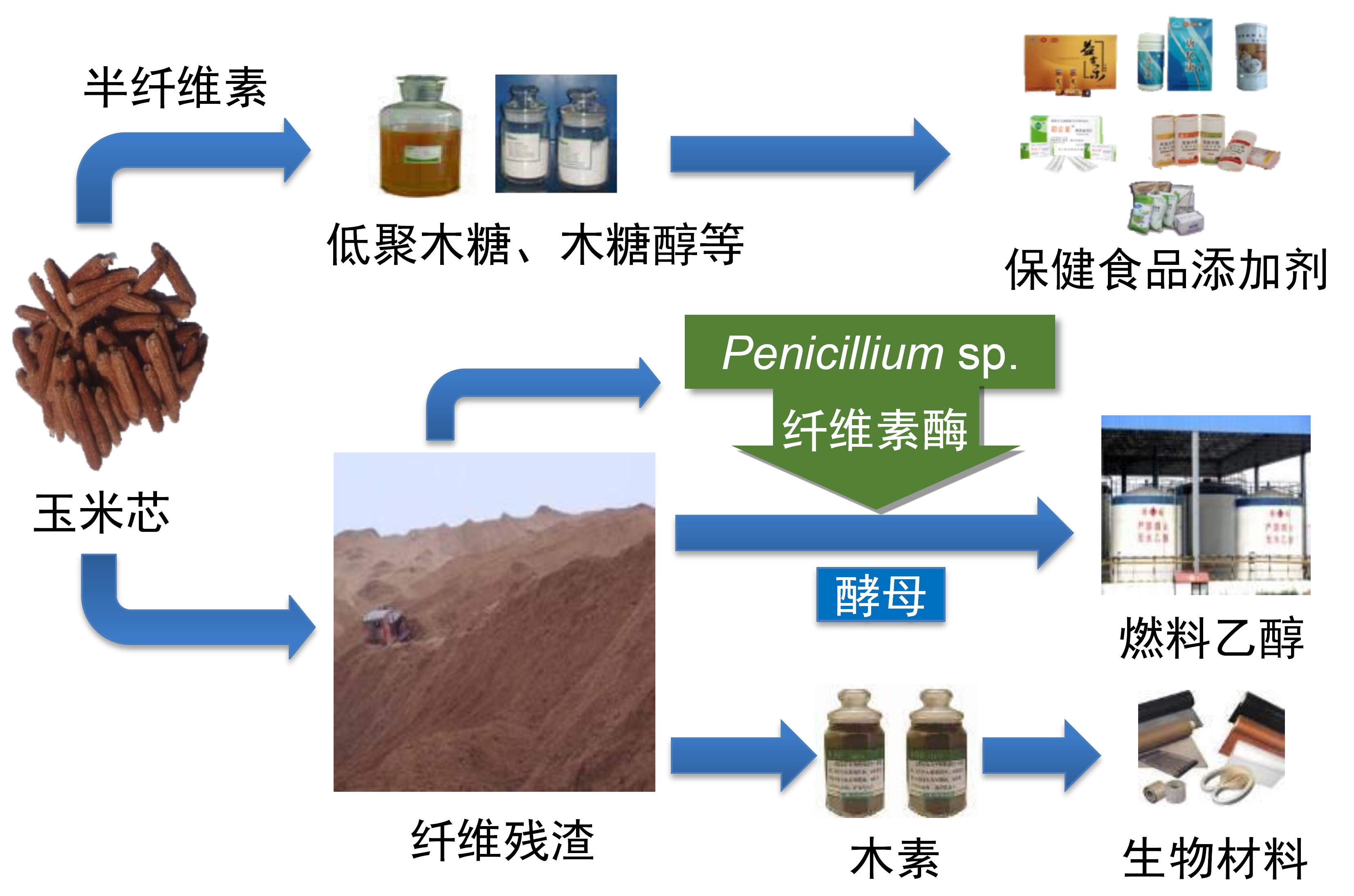 针对玉米芯、玉米秸秆等原料,提出了多条包含乙醇在内的多产品联产技术路线,实现了原料不同组分的充分利用,提升了整个生产系统的经济性。