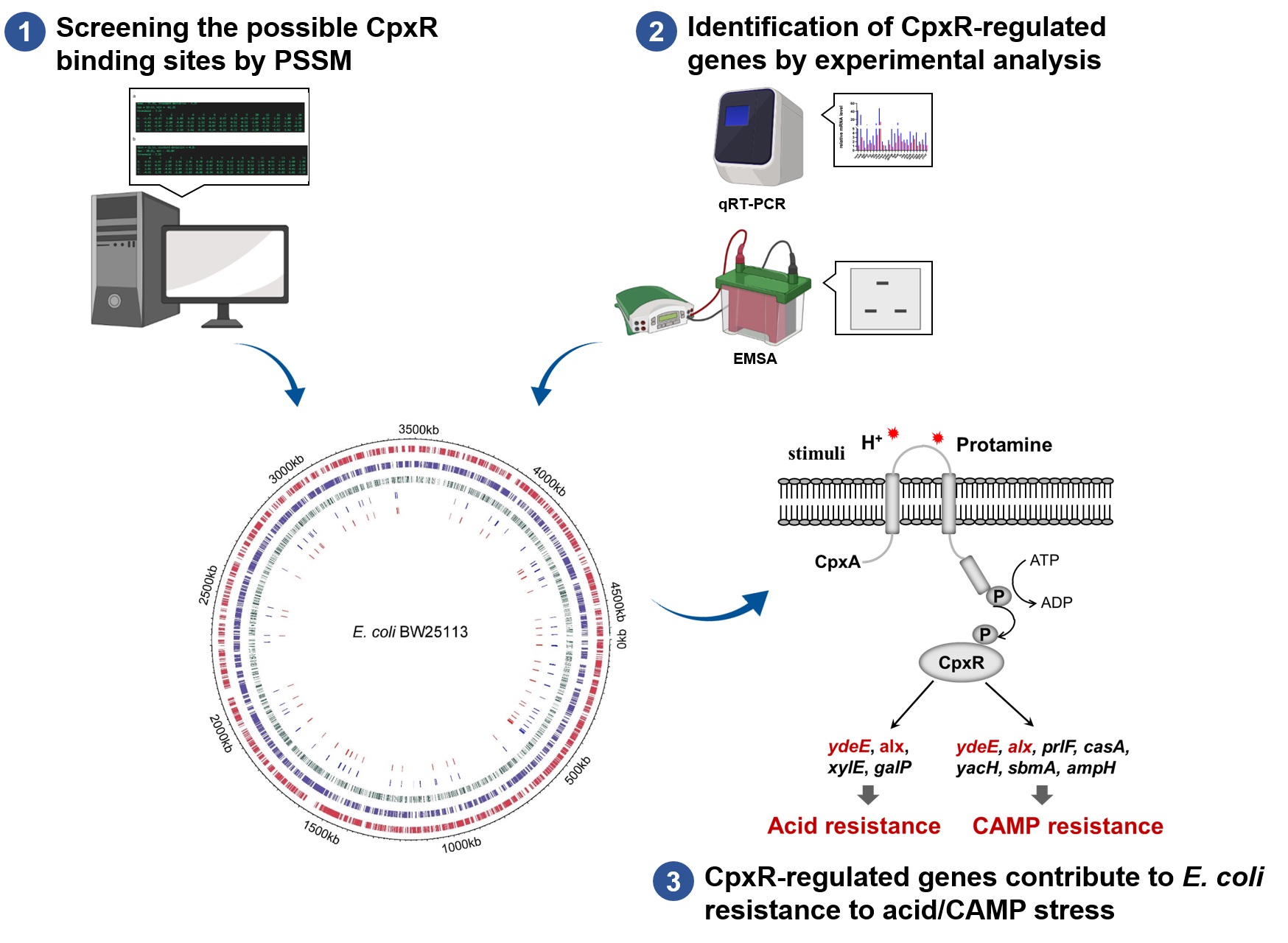 CpxRA系统是典型的细菌二组分信号传导系统,由传感激酶CpxA和响应调节蛋白CpxR组成,可感应环境压力信号并调节特定基因的转录,在细菌致病性、环境适应性等方面发挥着重要作用。在前期研究中,本团队发现了CpxRA系统可以直接感应酸性环境,并通过调控不饱和脂肪酸合成改变细胞膜组分,从而提升大肠杆菌的酸耐受性。但CpxRA系统下游靶基因的筛选和鉴定还不够系统和全面。