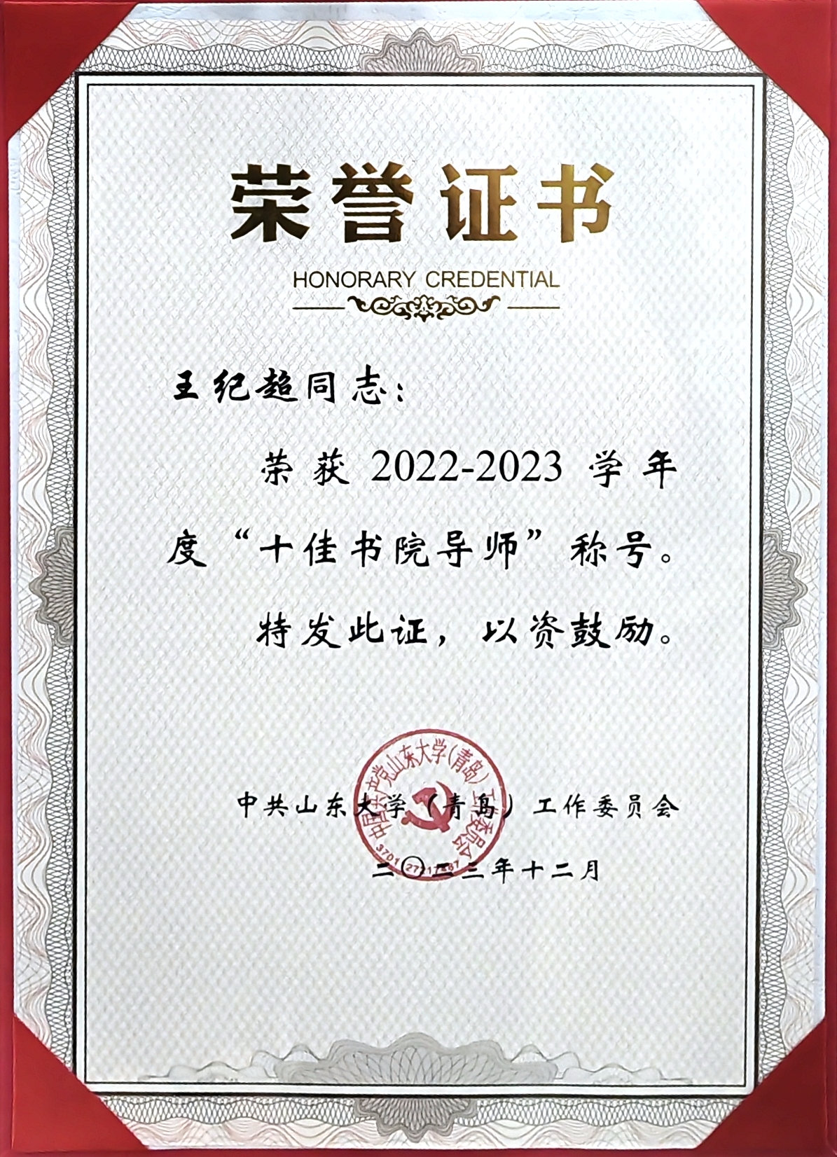 王纪超副研究员荣获2022-2023学年“十佳书院导师”称号!!