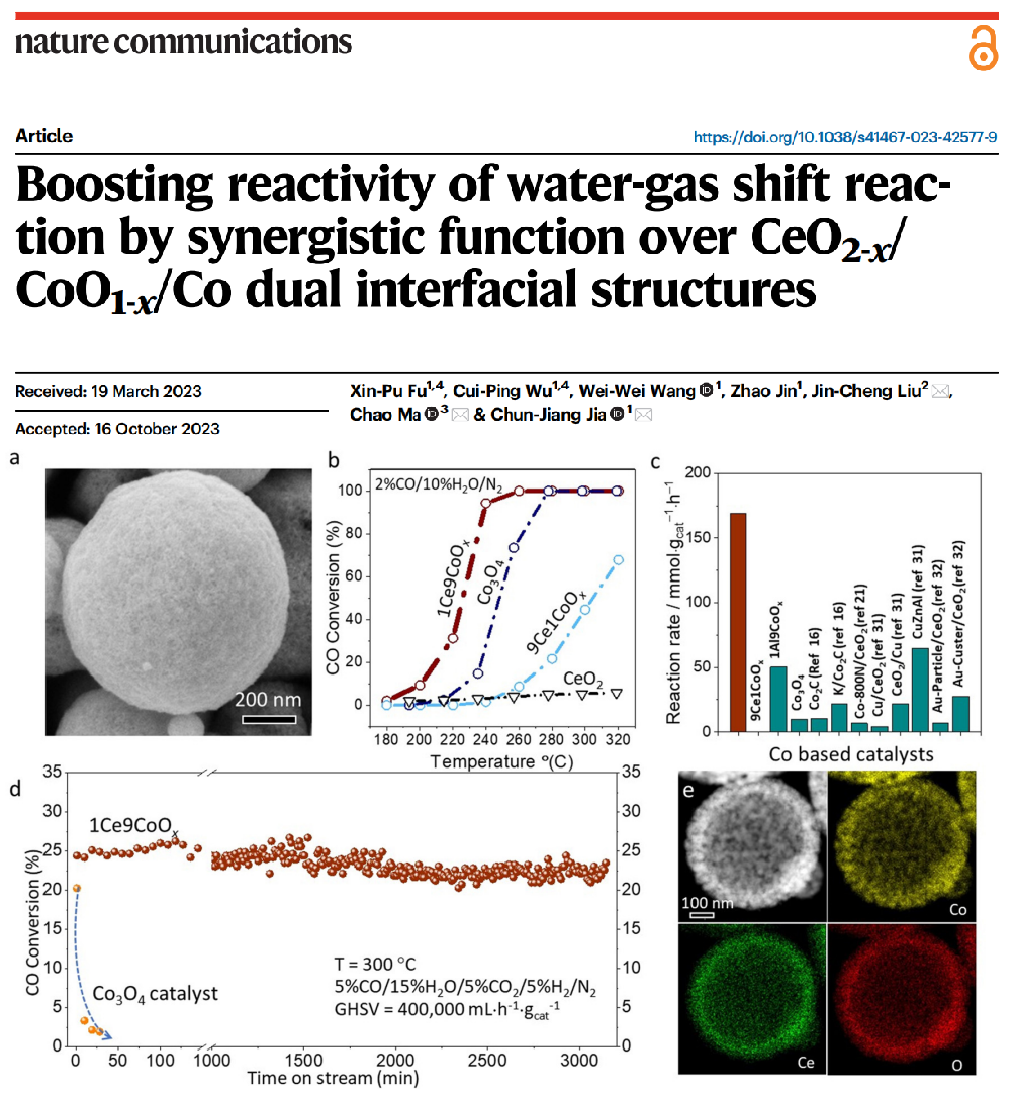 本文构建了高活性的CeO2-x/CoO1-x/Co双界面,在催化WGS反应中显示出很高的活性。测试结果表明,CeO2-x可调节Co物种的氧化态,从而在 WGS 反应过程中生成CeO2-x/ CoO1-x/Co双活性界面。验证了由CeO2-x/CoO1-x和CoO1-x/Co等双功能界面独立贡献组成的协同氧化还原机制,其中CeO2-x/CoO1-x界面减轻了 CO 中毒效应,而CoO1-x/Co界面促进了 H2的形成。这些结果为在催化剂中制造双界面结构提供了指导,并揭示了多组分催化剂体系的催化机理,本文被Nature Communications期刊接收。