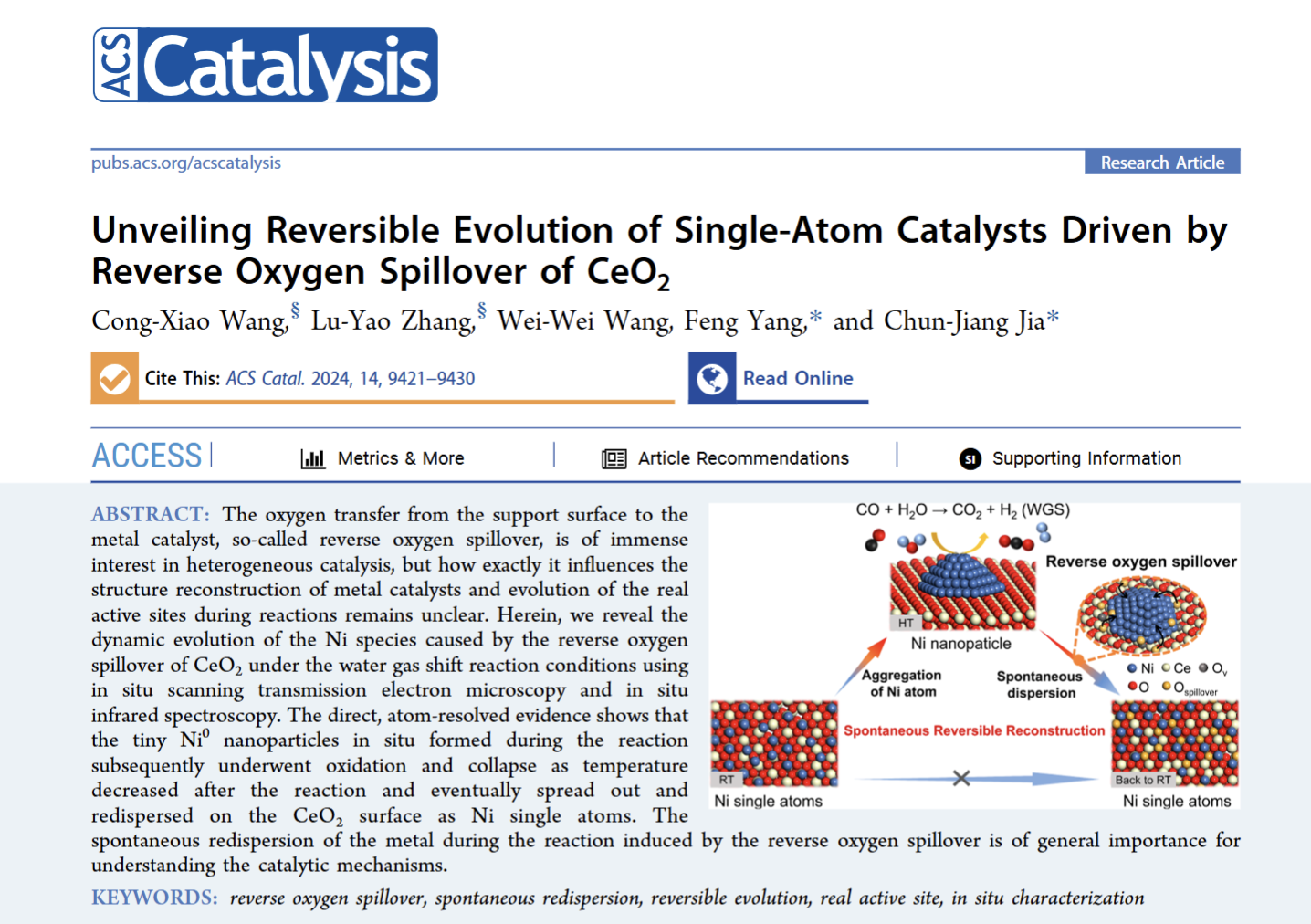氧从载体表面转移到金属催化剂上,即所谓的反向氧溢出,在异相催化中引起了极大的关注,但它究竟如何影响金属催化剂的结构重构和反应过程中真正活性位点的演化仍不清楚。在此,我们利用原位扫描透射电子显微镜和原位红外光谱,揭示了在水气变换反应条件下,CeO2 的反向氧溢出所引起的 Ni 物种的动态演化。原子分辨的直接证据表明,反应过程中在原位形成的微小 Ni0 纳米粒子在反应后随着温度的降低发生氧化和塌缩,最终以 Ni 单原子的形式扩散并重新分散在 CeO2 表面。反应过程中由反向氧溢出诱发的金属自发再分散现象对于理解催化机理具有普遍意义。