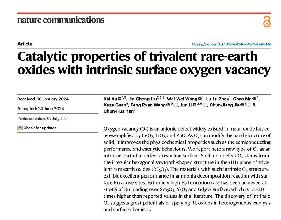 氧空位(Ov)是一种广泛存在于金属氧化物晶格中的阴离子缺陷,例如 CeO2、TiO2 和 ZnO。由于氧空位可以改变固体的能带结构,从而改善其物理化学性质,如半导体性能和催化行为。在此报告一种新型 Ov,它是完美晶面的内在组成部分。这种非缺陷 Ov 源自三价稀土氧化物 (RE2O3) (111) 平面上的不规则六边形锯齿状结构。具有这种固有 Ov 结构的材料在与表面 Ru 活性位点的氨分解反应中表现出卓越的性能。当 Sm2O3、Y2O3 和 Gd2O3 表面的 Ru 含量约为 1 wt%时,H2 生成率极高,是文献报道值的最高值。本工作表明在异相催化和表面化学中应 RE 氧化物具有巨大的潜力。