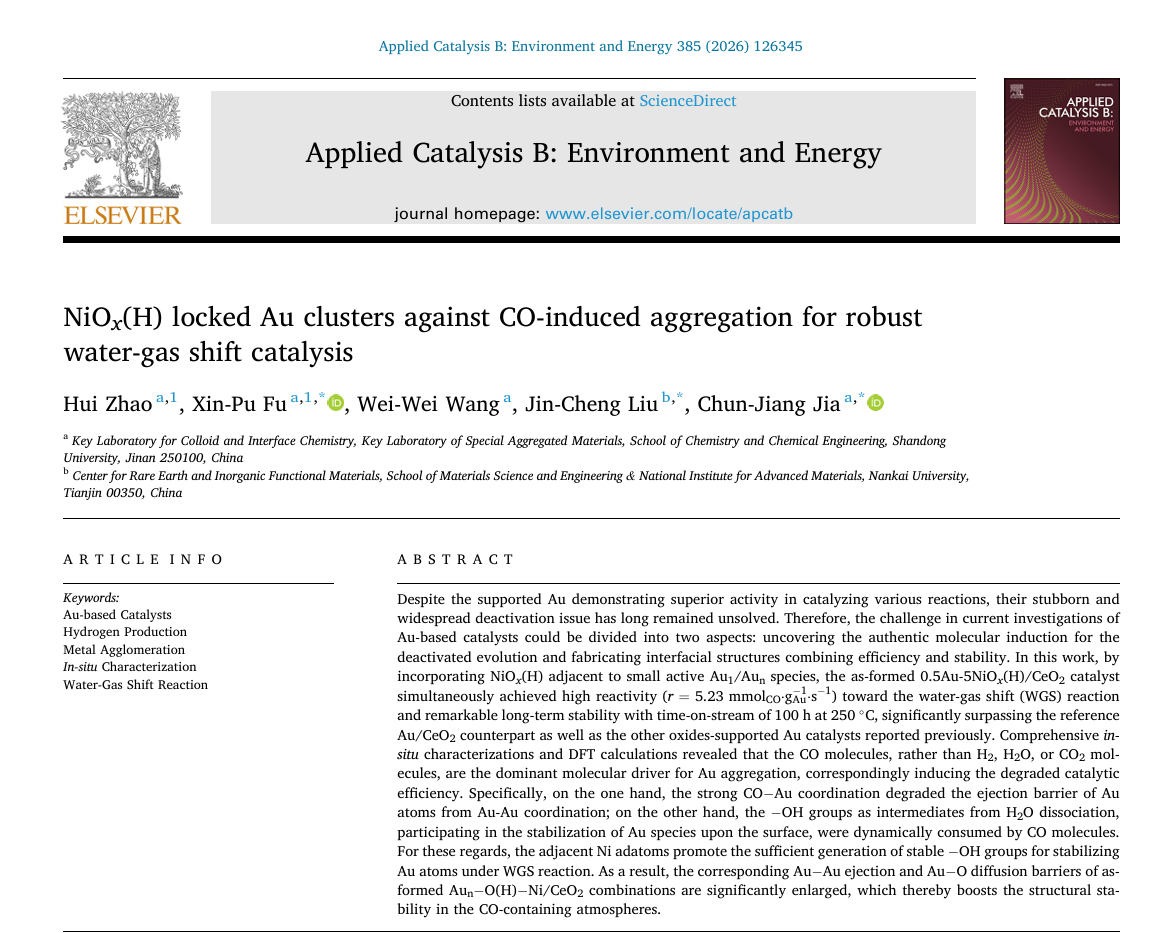 在本研究中,通过将NiOx(H)引入活性Au物种附近,构建了0.5Au-5NiOx(H)/CeO2催化剂。该催化剂在水煤气变换反应中同时表现出高活性与优异的长期稳定性,其性能显著超过常规Au/CeO2及已报道的多数氧化物负载型金催化剂。综合原位表征与理论计算表明,CO分子是诱导金物种聚集并导致失活的关键因素:一方面,强CO-Au配位作用降低了金原子迁移的能垒;另一方面,CO会动态消耗稳定金物种所必需的表面-OH基团。邻近Ni原子的引入促进了足量稳定型-OH基团的生成,从而在反应条件下有效锚定金原子,大幅提高了金活性位点在含CO气氛中的结构稳定性。
