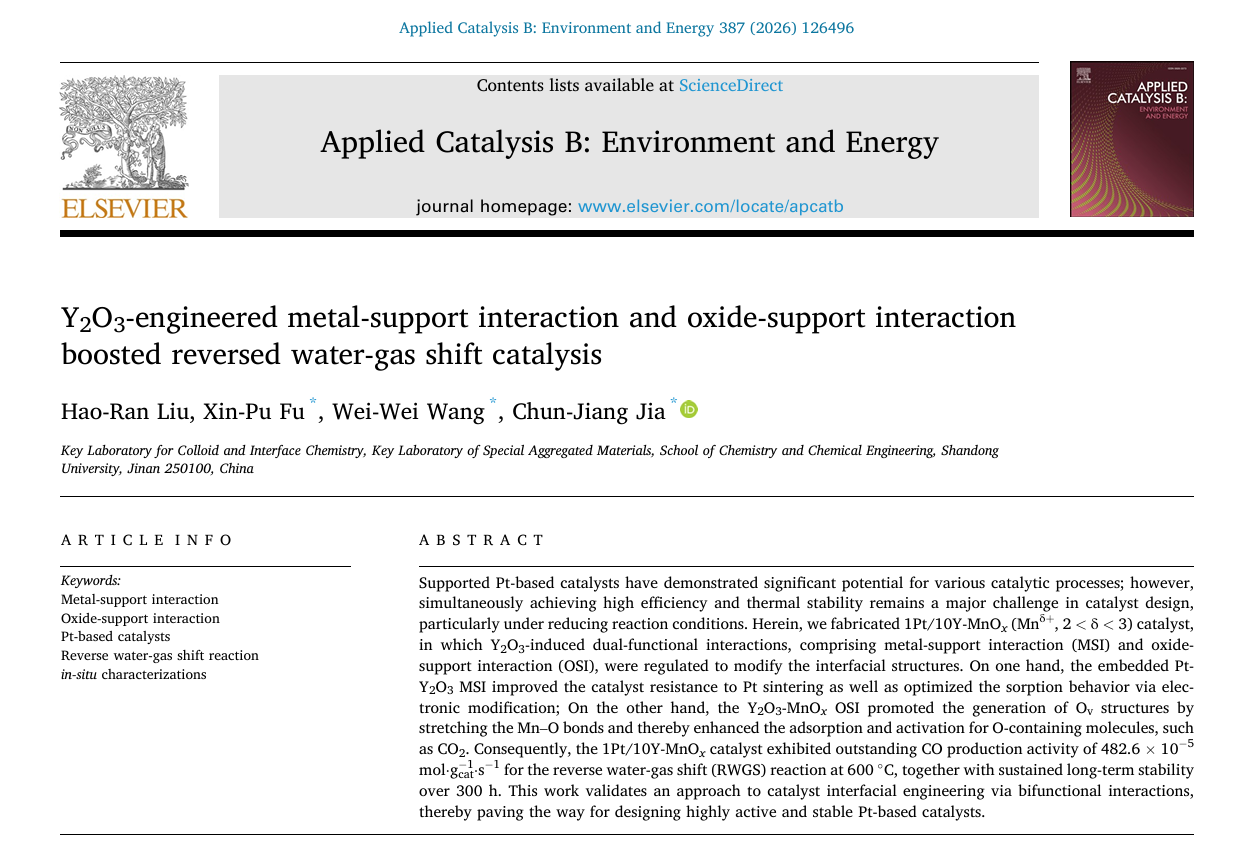 贾春江课题组在实现Y2O3双重作用应用于逆水煤气变换反应中取得重要进展!