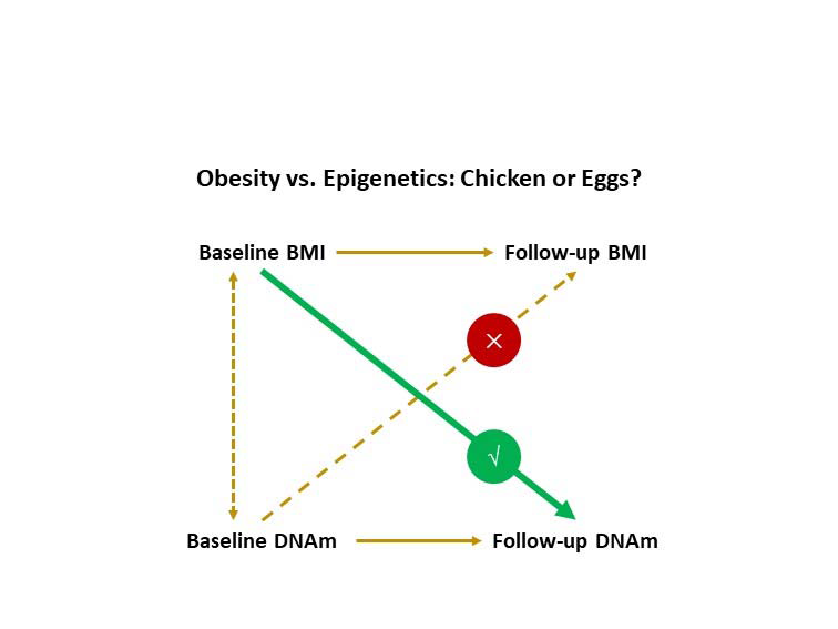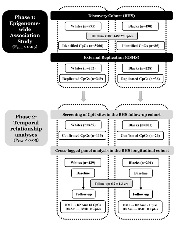 以往的全表观遗传组关联研究(Epigenome-wide association study, EWAS)表明,肥胖可能是DNA甲基化变化的原因,而不是结果。然而,缺乏纵向观察的人群研究证据。本研究目的一是确定与体重指数(BMI)相关的CpG甲基化位点,二是在纵向重复测量队列中研究DNA甲基化和体重指数动态变化之间的时序关系(Temporal Sequence)。本研究首先在Bogalusa心脏研究中针对995名白人和490名黑人进行了种族特异性的EWAS研究,并进一步在Georgia Stress and Heart Study队列中的252名白人和228名黑人进行了重复验证。第三阶段,基于Bogalusa心脏研究纵向队列中的439名白人和291名黑人间隔6.2年的两次重复测量数据,使用交叉滞后时序分析(Cross-lagged panel analysis)检验DNA甲基化变化与体重指数改变的时序因果关系。