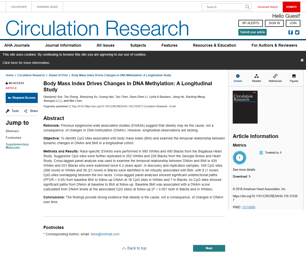 2019年9月17日,《Circulation Research》在线发表了一项关于肥胖表观遗传组学和纵向时序因果推断的国际合作研究“Body Mass Index Drives Changes in DNA Methylation: A Longitudinal Study”《体质指数驱动DNA甲基化的变化:人群纵向研究》,北京大学公共卫生学院孙点剑一副研究员、山东大学公共卫生学院张涛教授、美国Augusta大学乔治亚医学院Shaoyong Su教授为论文的共同第一作者,美国明尼苏达儿童医院Shengxu Li研究员和美国杜兰大学Wei Chen教授为论文的共同通讯作者。