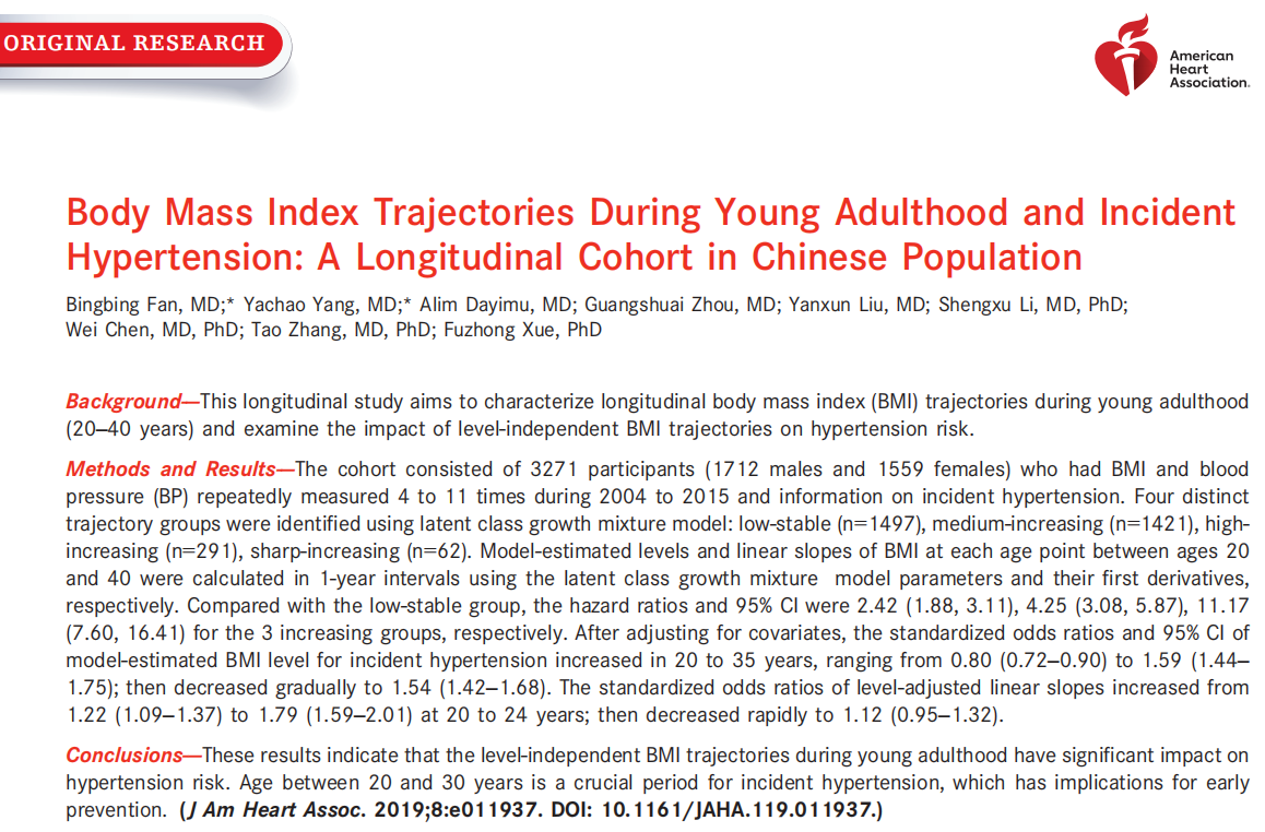 公共卫生学院生物统计学系张涛教授团队在美国心脏病协会杂志《Journal of the American Heart Association》上发表原创论文“Body Mass Index Trajectories During Young Adulthood and Incident Hypertension: A Longitudinal Cohort in Chinese Population”, J Am Heart Assoc. 2019; 8:e011937,2017级硕士范冰冰和威海市立医院杨亚超主任为论文共同第一作者。同时,JAHA杂志配发了题为“Obesity‐Induced Hypertension: Heavy on the Accelerator”的Editorial论文,解释了肥胖和高血压的可能致病机理,对论文的公共卫生意义进行了点评。
