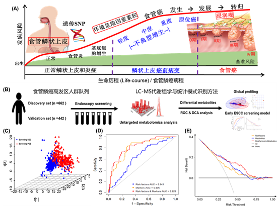 该系列研究成果在小分子水平上筛选了食管鳞癌代谢组标志物,研究食管鳞癌发生发展的相关代谢途径,并建立了高发区人群早期筛查模型,为食管癌早诊早治提供了重要依据。 上述研究工作得到了国家自然科学基金面上项目、山东大学齐鲁青年学者项目、山东大学青年交叉科学创新群体建设项目。国家健康医疗大数据研究院为本研究工作提供了重要平台支持。张涛教授课题组长期从事生命历程纵向队列分析与应用研究,面向“慢性病全生命周期防控”重大需求,沿着生命历程/疾病进程和“轨迹分析-因果推断-组学标志物和预测模型”统计分析链条,在生命历程流行病学理论模型研究基础上,提出了生命历程关键期模型和因果图模型的分析方法,基于心血管病和恶性肿瘤纵向队列系统研究了危险因素和组学标志物的轨迹特征、因果路径、组学标志物及其预测模型,揭示了生命历程早期心血管病防控关键期和因果链,确定了心血管病DNA甲基化以及食管癌代谢组分子标志物,为慢性病全生命周期动态轨迹监测和精准病因防控提供了纵向队列证据。近年来在Circulation Research、Hypertension、Diabetologia、Clin Transl Med、J Am Heart Assoc、J Proteome Res等国际权威期刊发表科研论文30余篇,被引用1460次。课题组主页:https://faculty.sdu.edu.cn/lifecourse。