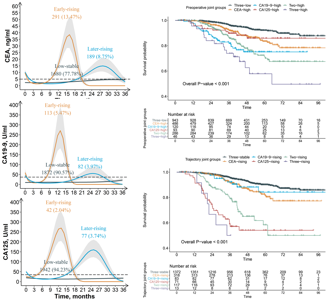 癌胚抗原 (CEA) 是结直肠癌 (CRC) 的重要肿瘤标志物,术前和术后血清CEA均与CRC结局有关。但是大多数研究仅关注术前或有限个术后时间点上的CEA测量,而忽略了术后CEA的动态变化。在Clin Transl Med的论文中,课题组使用潜在类别增长混合模型 (LCGMM)识别了结直肠癌 (CRC) 患者的CEA动态变化轨迹,并发现与平稳轨迹组相比上升轨迹组有更高的死亡及复发风险。