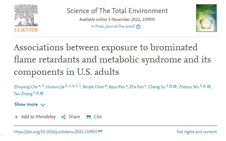 近日,公共卫生学院生物统计学系张涛教授团队在Science of The Total Environment(IF=10.753,JCR 1区)上发表了题为“Associations between exposure to brominated flame retardants and metabolic syndrome and its components in U.S. adults”的论文,张涛教授、中国疾病预防控制中心营养与健康所研究员苏畅、复旦大学副教授武振宇为论文的共同通讯作者,山东大学公共卫生学院生物统计学系硕士研究生车志强、上海交通大学贾慧珣为该论文的共同第一作者,山东大学为第一作者和通讯作者单位。