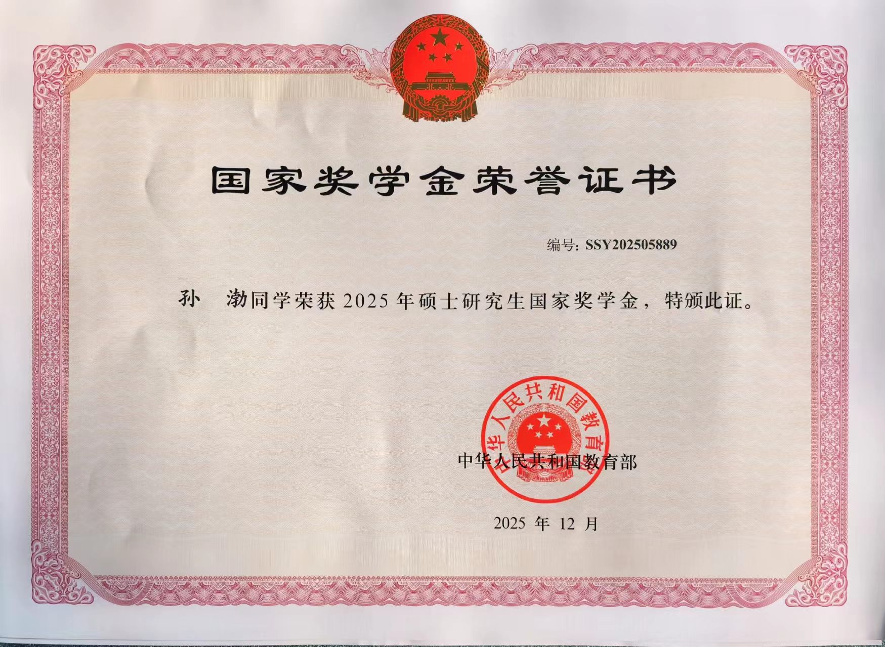 喜报传来!在近日公布的研究生国家奖学金评选结果中,我课题组孙渤同学凭借优异的学业成绩、突出的科研能力,成功斩获研究生国家奖学金殊荣!特此向孙渤同学表示热烈祝贺,向悉心指导他的导师、支持他的同门及全体师生致以诚挚的谢意!