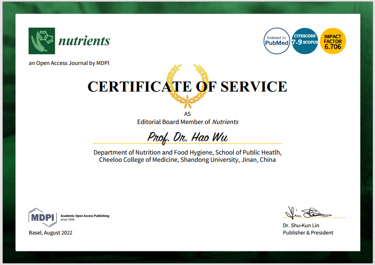 近日,吴昊教授担任医学顶刊Nutrients(中科院二区,5年IF 7.185)Nutrigenetics and Nutrigenomics Section(营养遗传学和营养基因组学)常驻编委。