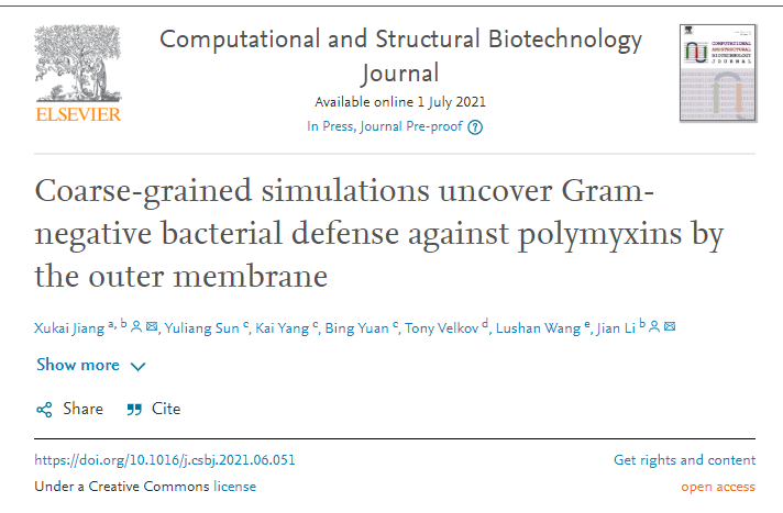 近日,山东大学糖工程技术研究中心蒋绪恺副研究员与莫纳什大学Jian Li教授团队合作在《计算与结构生物技术杂志》 (Computational and Structural Biotechnology Journal, JCR Q1, 5-year IF: 7.409)上在线发表了题为“Coarse-grained simulations uncover Gram-negative bacterial defense against polymyxins by the outer membrane”的研究论文。糖工程技术研究中心蒋绪恺副研究员为本文第一作者和共同通讯作者,山东大学国家糖工程技术研究中心为第一单位和通讯单位。