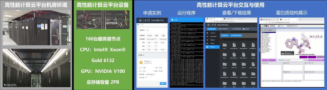 山东大学一直以来积极推进和探索大数据与高性能计算在生物学研究领域的学科交叉,初步构建了“快测-快存-快拼-快算”的全新模式。特别是基于我校高性能计算云平台,采用云计算行业中先进的容器技术,进行高效的环境配置和搭建,实现了“一次构建多次部署”的快速应用模式。近日,依托高性能计算云平台,软件学院与微生物技术研究院紧密配合针对AlphaFold2、RoseTTAFold等软件开展蛋白质结构预测计算环境的建设工作,构建了蛋白质结构预测应用镜像,建设了2.2TB相关的数据库资源,基于多GPU节点实现了高通量并行批量预测蛋白质结构技术。