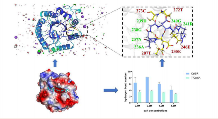 the structural and dynamic differences may contribute to the various catalytic halotolerance of Cel5R and TfCel5A. These findings provide mechanistic insight into the halotolerant catalysis and will guide the ration design of GH5 cellulases with improved catalytic properties.
