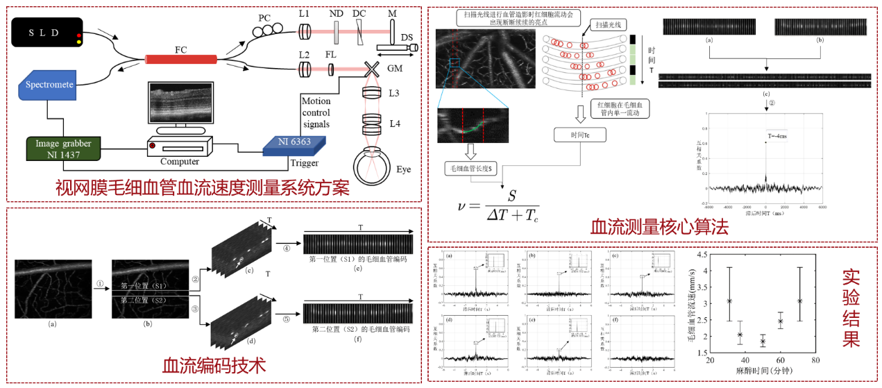 针对视网膜微血管血流速度难测量问题,采用高速高分辨OCTA与血流编码技术,研发了毛细血管血流速度测量系统,实现了大视场毛细血管血流速度的精准测量,达到了国际领先水平。