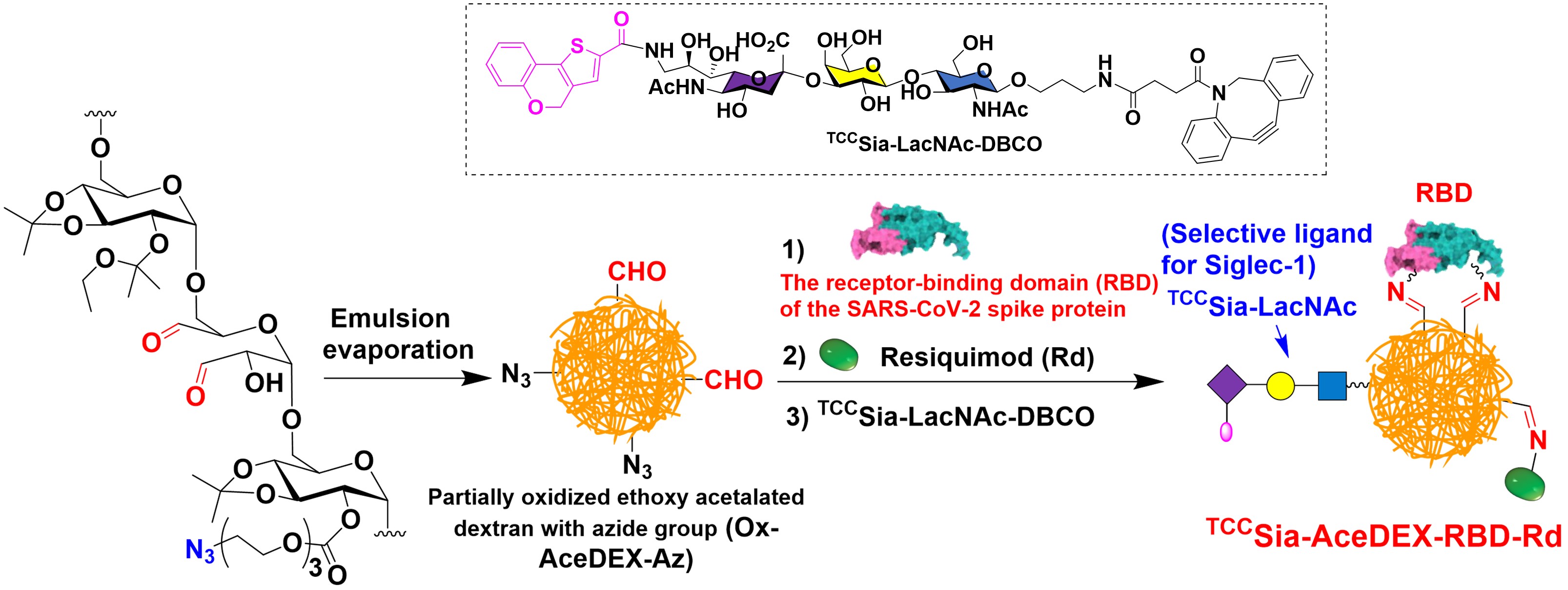 We engineered a glyconanoparticle system, TCCSia-Ace-Dex-RBD-Rd, that targets Siglec-1 and enhances macrophage delivery through a high-affinity trisaccharide ligand. This platform elicited potent anti-RBD (receptor-binding domain) neutralizing IgG antibodies, exceeding the efficacy of a traditional alum-adjuvanted vaccine (Adv. Sci. 2023). To ensure broader variant coverage, we also designed a PC7A micelle-based RBD vaccine with a CpG adjuvant, which induced cross-neutralizing antibodies against Omicron subvariants (BA.5–KP.2) and provided robust in vivo protection (ACS Nano 2025).