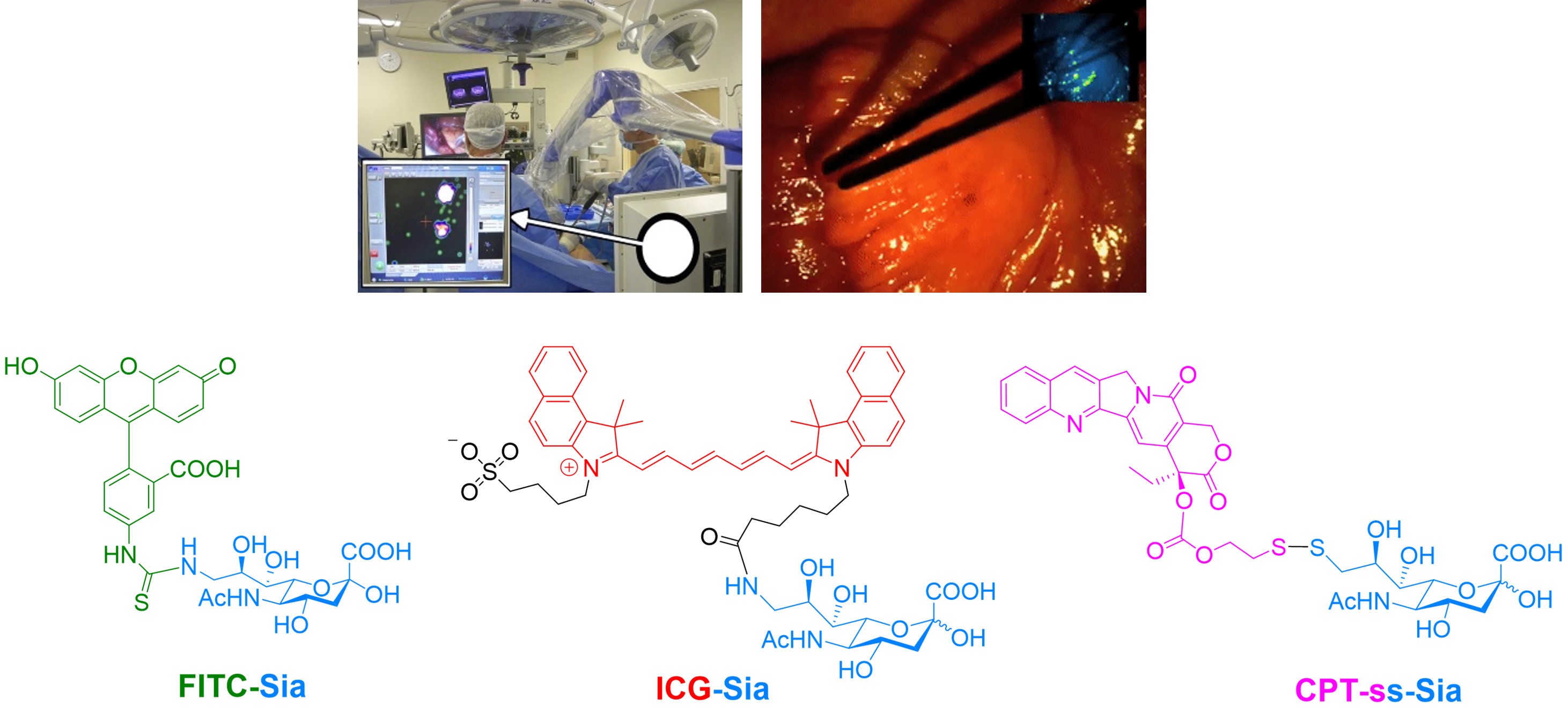 (1) Fluorescein Isothiocyanate-Conjugated Sialic Acid (FITC-Sia) for Tumor Imaging: FITC-Sia effectively labeled cell membranes, enabling localization of murine hepatocellular carcinomas smaller than the clinical detection threshold. This work challenged the conventional view (e.g., Prof. Bertozzi's group) that only sialic acid derivatives with small substituents can be metabolically incorporated into cell membranes, demonstrating that C9-modified sialic acid with bulky groups retains metabolic viability (Biomater. Sci. 2014).