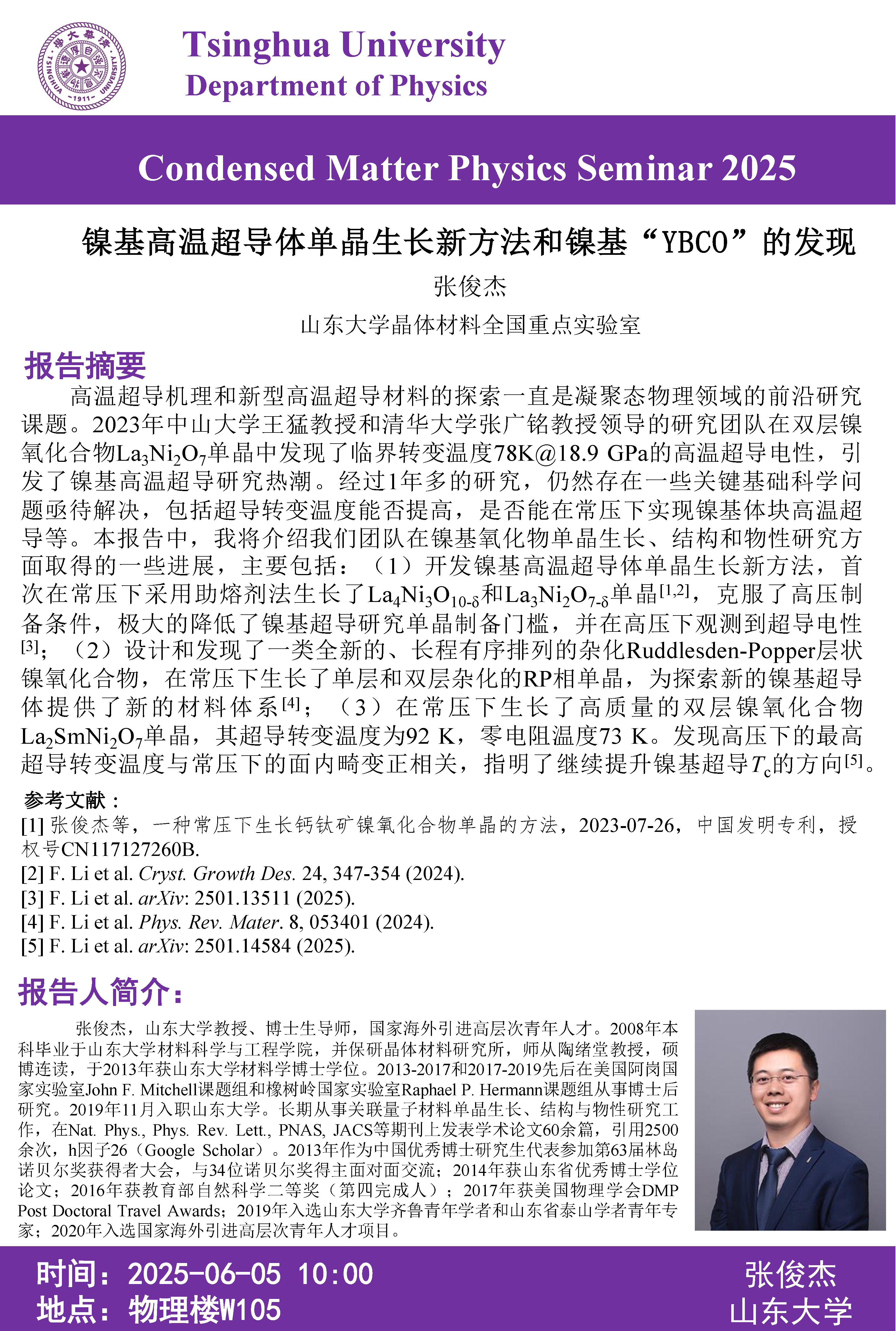 受清华大学王亚愚教授的邀请,张俊杰教授将于2025年6月5日访问清华大学并做题为“镍基高温超导体单晶生长新方法和镍基“YBCO”的发现”的学术报告。